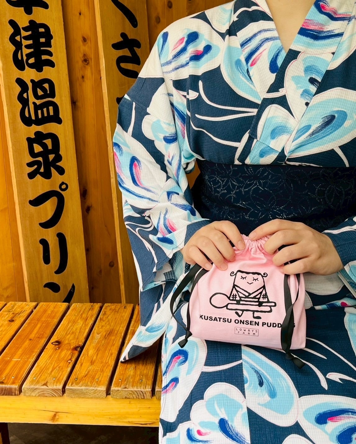 生成りの白とピンクの二色をご用意し、どちらも表と裏の文字を反転させるなど、さりげない遊び心を取り入れたこちらの商品は、温泉地の散策に加え