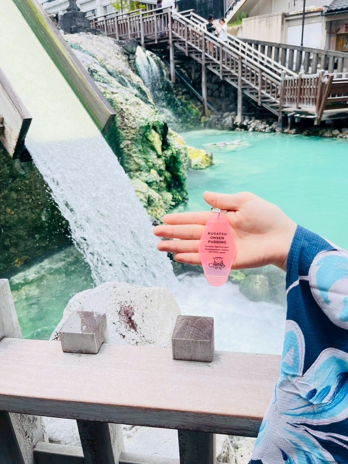 草津温泉の観光名所「湯畑」の鮮やかなエメラルドグリーンをイメージしたグリーンと、他の商品と同様可愛らしいピンクの二色をご用意し、ご自身は勿論、大切な方へのお土産としても幅広くご活用いただけるよう仕立てました。